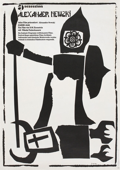 The character of Prince Alexander is portrayed as an all-conquering warrior, standing triumphantly over a fallen knight. His helmet and shield bear the distinctive shape of the medieval Rus’ military, while the horned helmet of the defeated figure bears the Teutonic order’s cross motif. The film was an overtly political allegory, depicting the growing threat to the Soviet Union from Nazi Germany in the late 1930s - the German knight features the clawed feet of a predatory animal, which is also a reference to the black eagle of the Nazi insignia. In contrast, the virtuous Nevsky bears a flower - the perfect symbol of life, beauty and hope.