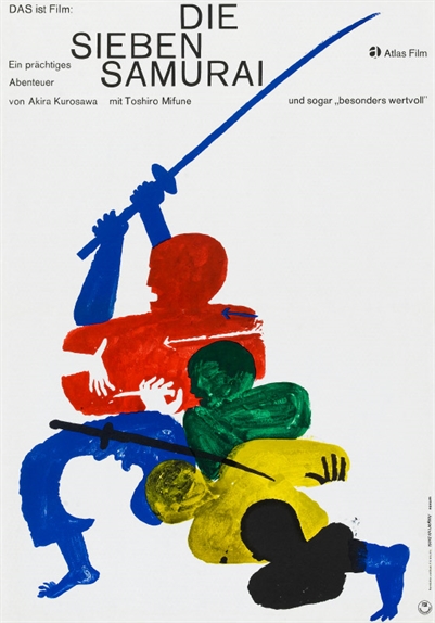 Perhaps the most striking of the many Seven Samurai posters, an altogether satisfying piece of thoughtfully crafted design, and a rare example of a poster that actually does justice to the Japanese masterpiece. While the footage itself is monochrome, all other aspects of the film are vibrant and varied, as this design conveys.
