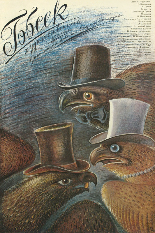 Veteran poster designer Volf paints a satirical treatment of the multi-faceted Balzacian stereotypes; beneath their grandeur and bourgeoise finery they are likened to birds of prey, hunters, ruthless and self-interested, competing among themselves for pieces of gold.