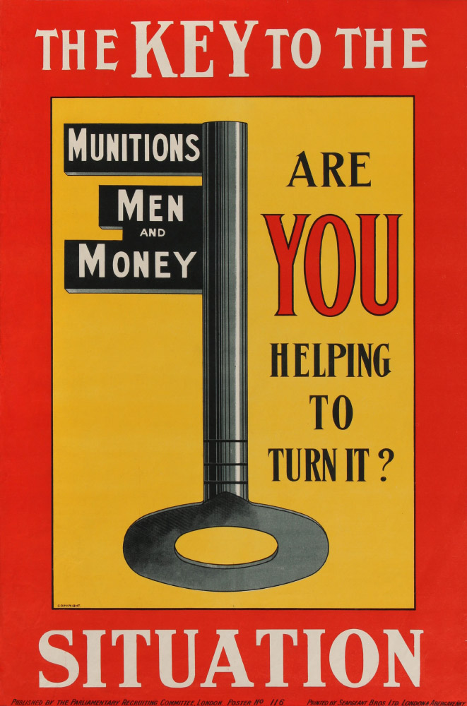 One of hundreds of posters produced by the British government during WWI to encourage the population to support the war effort. Posters often requested monetary loans as well as personnel recruitment.
