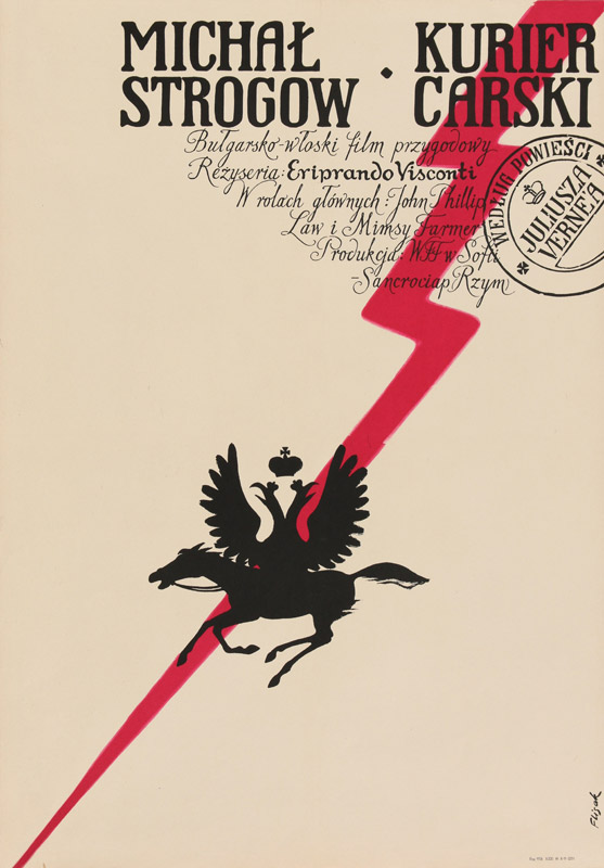 A simple galloping horse conjoined with the Imperial Standard of the Tsar embodies the Courier Strogoff, and the credits are fashioned into the likeness of a mailing envelope with elegant handwriting and circular postal stamp, gathering above in a cloud of political unrest. The mighty flash from the storm strikes the exposed figure as he tries to cross hostile territory. It bisects the page like a bloodied sabre, suggesting the conflict that threatens to divide the whole of Russia, east from west.