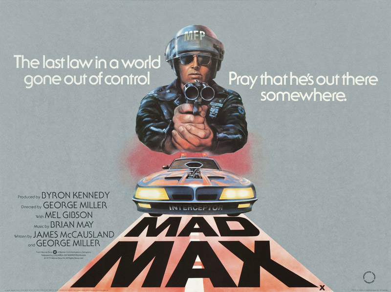 The film’s high octane chase sequences are shot from a low angle to heighten the sense of speed as the camera blazes along the highways; this is nicely captured with the dramatic perspective of the title lettering overlaid onto the road, with the Interceptor heading straight at us and seeming to violate the picture plane. Also in our face is Max’s double-barrelled sawn-off, his weapon and hands foreshortened in an attempt to project them from the page.