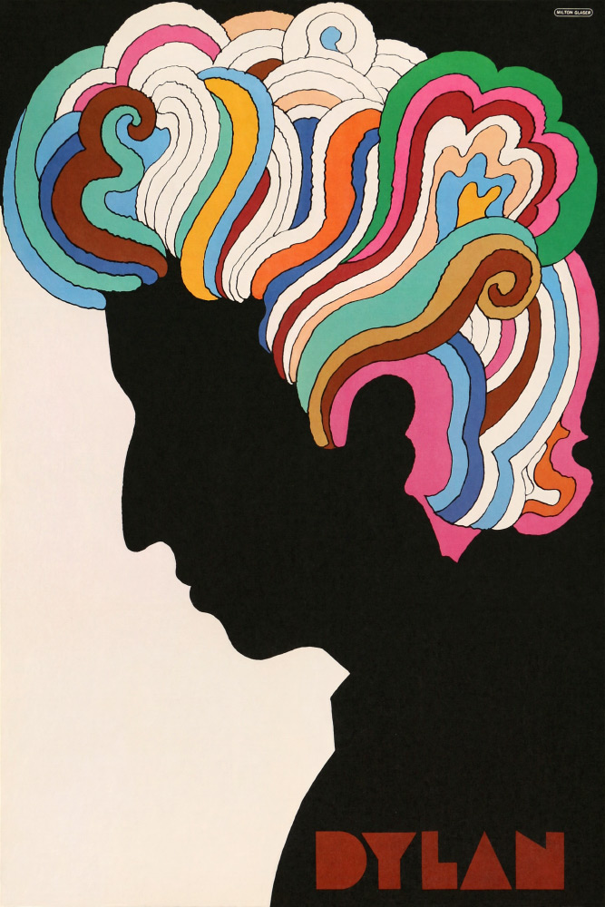 This poster featuring the iconic silhouette of Bob Dylan was issued with the Greatest Hits LP in 1967. Some claim that the name ‘Elvis’ is written within the psychedelic curls of hair, but Glaser stated that this was never consciously intended.