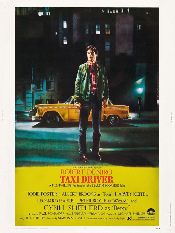 Dark, brooding, paranoid isolation and the menace of the urban environment are central themes in Taxi Driver’s intense character study, and all are perfectly represented in Guy Peelleart’s disconcerting image. It is clear from the way he glances furtively in the shadows of the deserted street that Travis is a troubled individual, and something sinister is in the works.